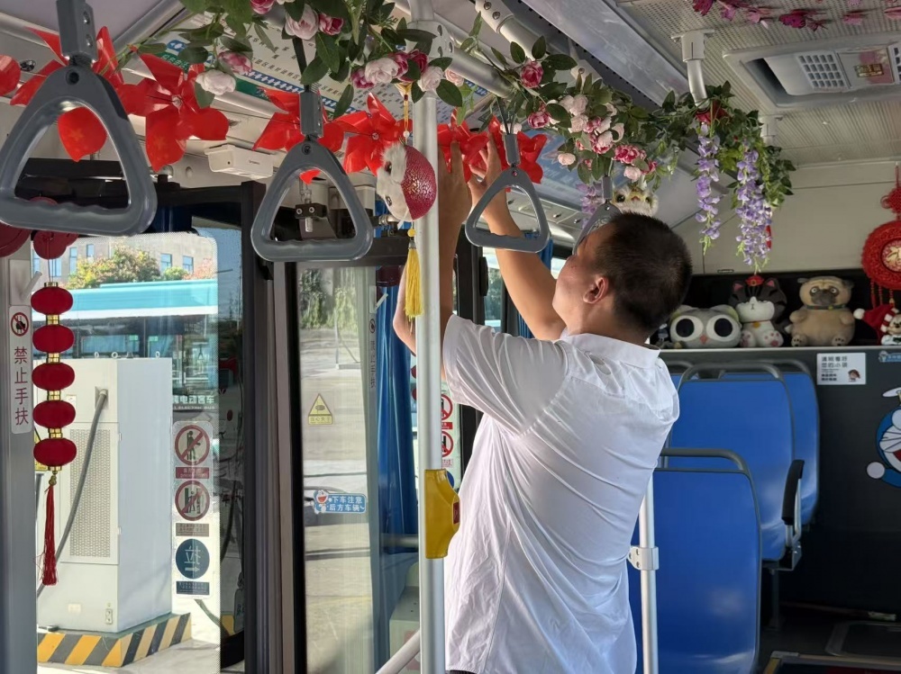 張峻峰是荊門公交2024年度“最美公交人”,他的車上總比別人多點(diǎn)“暖心”東西:駕駛座旁的小盒子里備著暈車藥、創(chuàng)可貼和折疊傘。“今年國慶,就想乘客上車能樂呵樂呵?!庇谑菑埦寰蛣?dòng)了裝飾車廂的念頭。他自費(fèi)買了小國旗、風(fēng)車、燈籠等裝飾,晚上在家剪剪貼貼,白天利用休息時(shí)間在車上裝飾。張峻峰的行動(dòng),也是荊門公交服務(wù)提升的一個(gè)縮影。